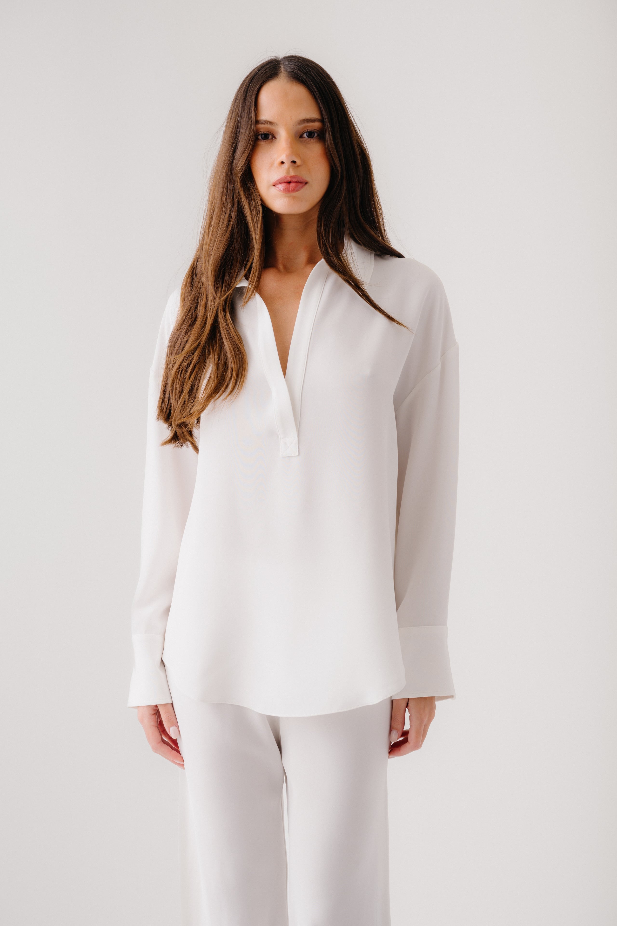Relaxed silk popover with open neckline and dropped shoulder.