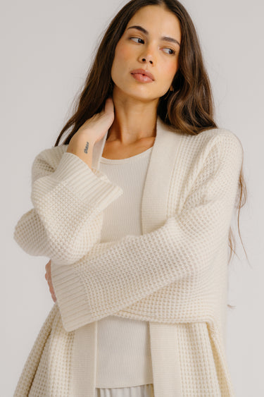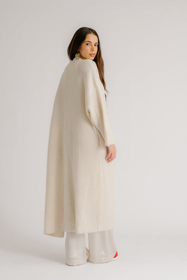 Full-length open-front duster in chunky waffle knit with functional pockets.