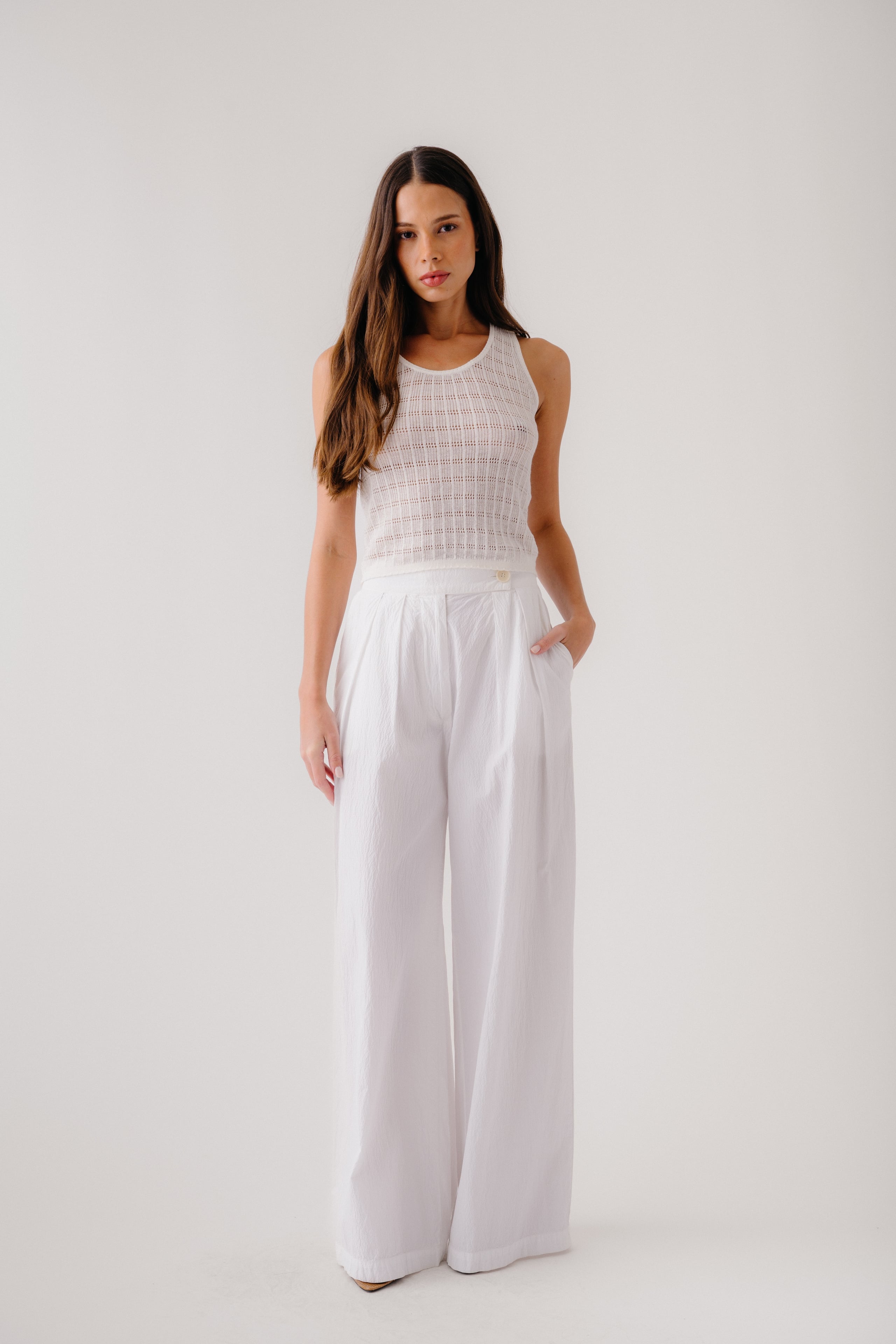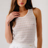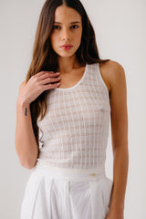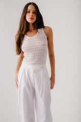 Pointelle stitch scooped neck tank in cotton silk cashmere.