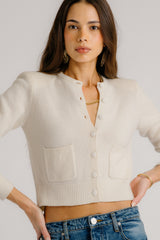 Cropped cardigan with ribbed trim, patch pockets, and structured shoulders.
