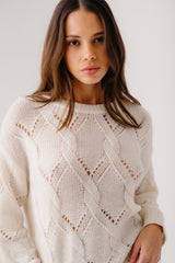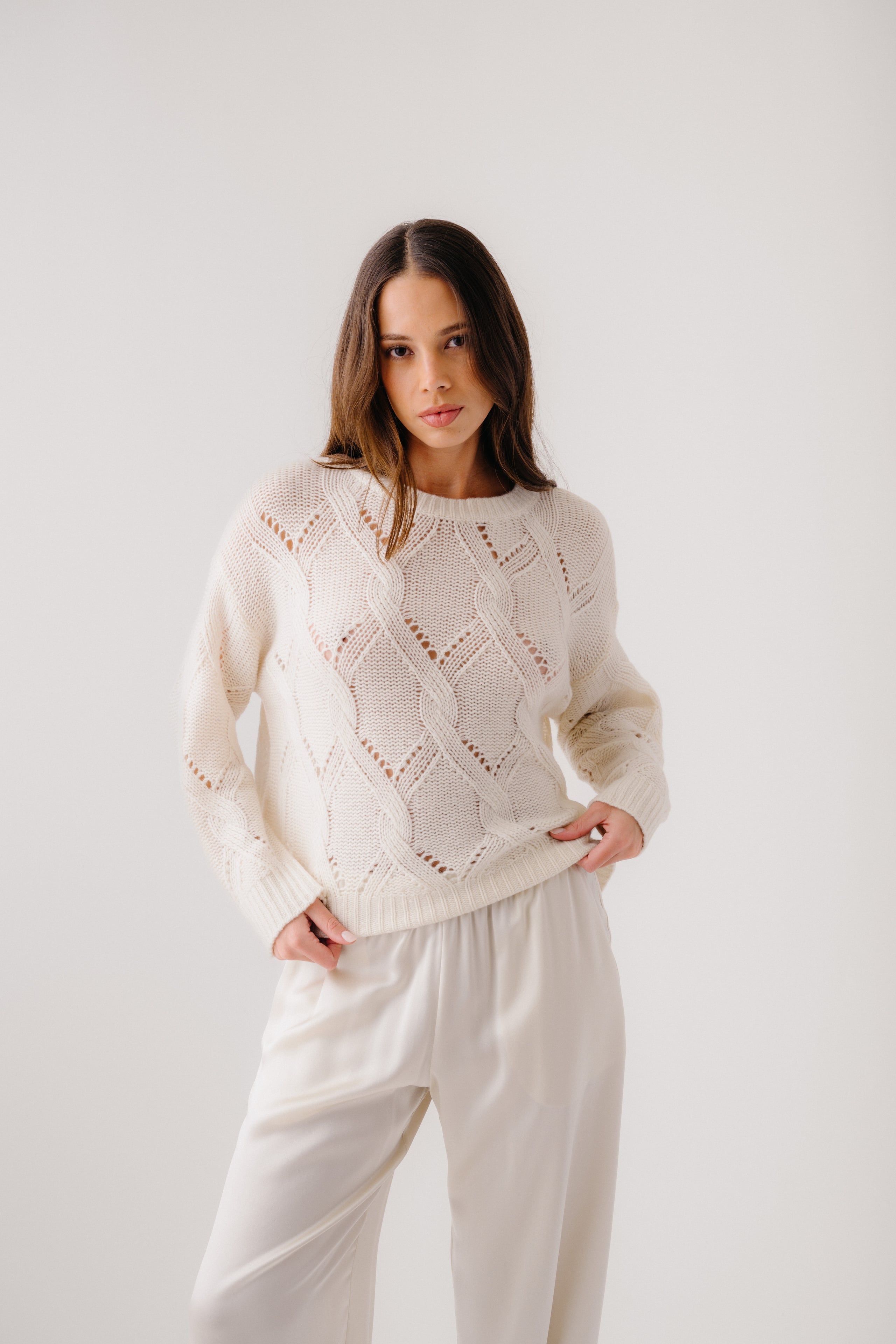 GIA SLOUCHY CABLE KNIT CASHMERE CREWNECK SWEATER | GARDENIA