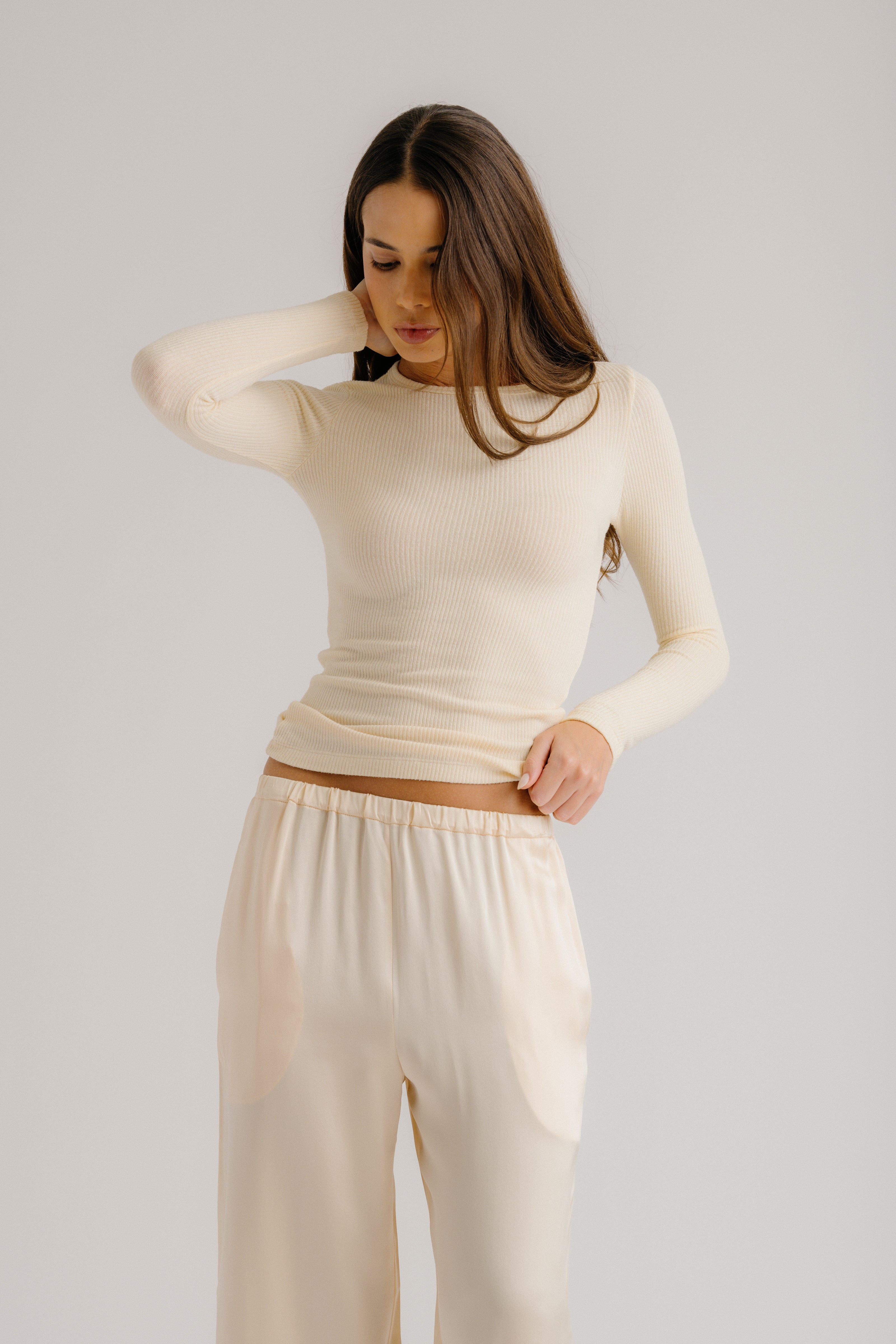 Fitted long-sleeve crewneck tee in ribbed knit.