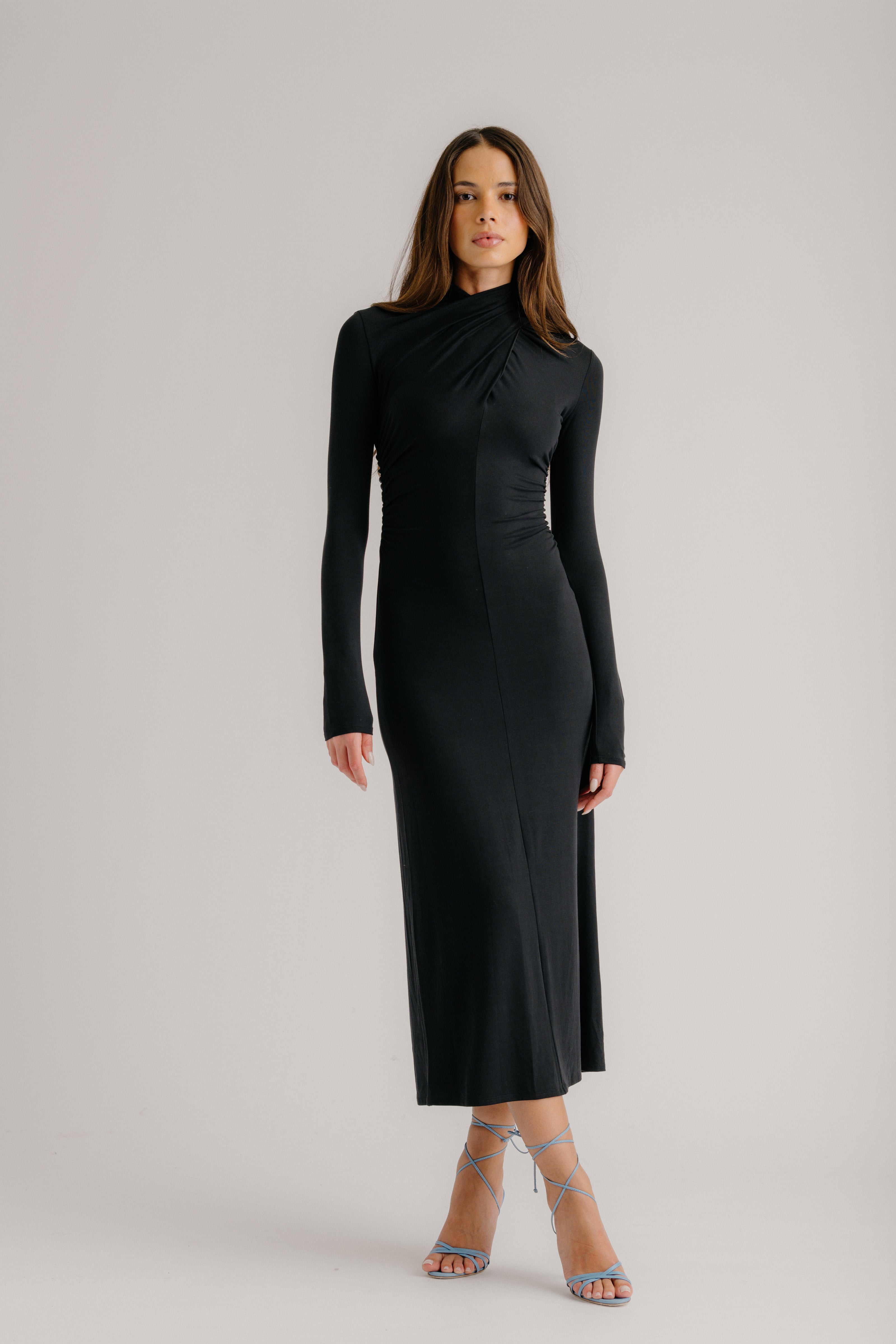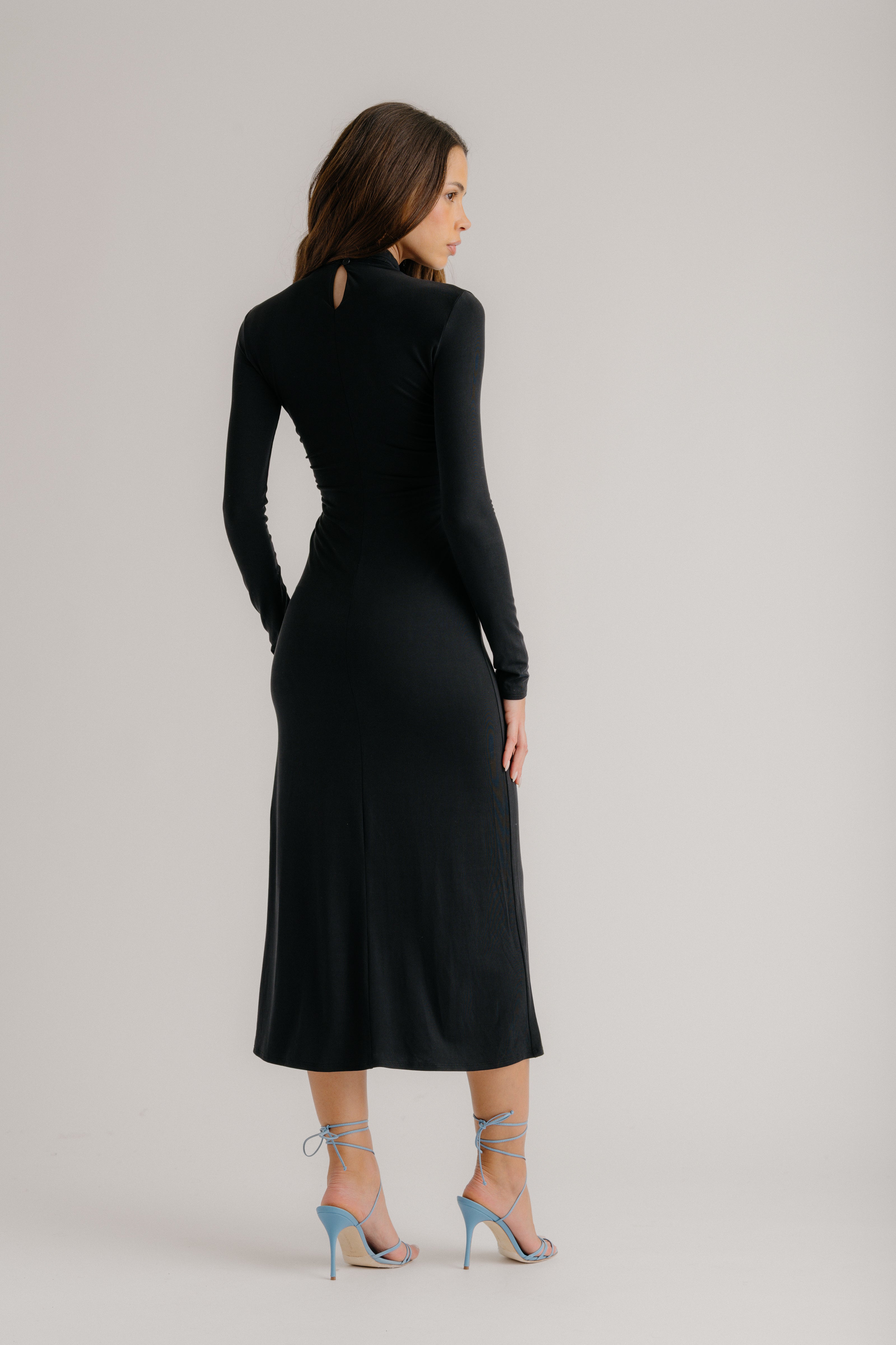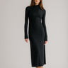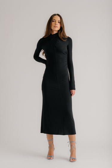 QUINN CROSSOVER MOCK NECK MIDI DRESS | BLACK