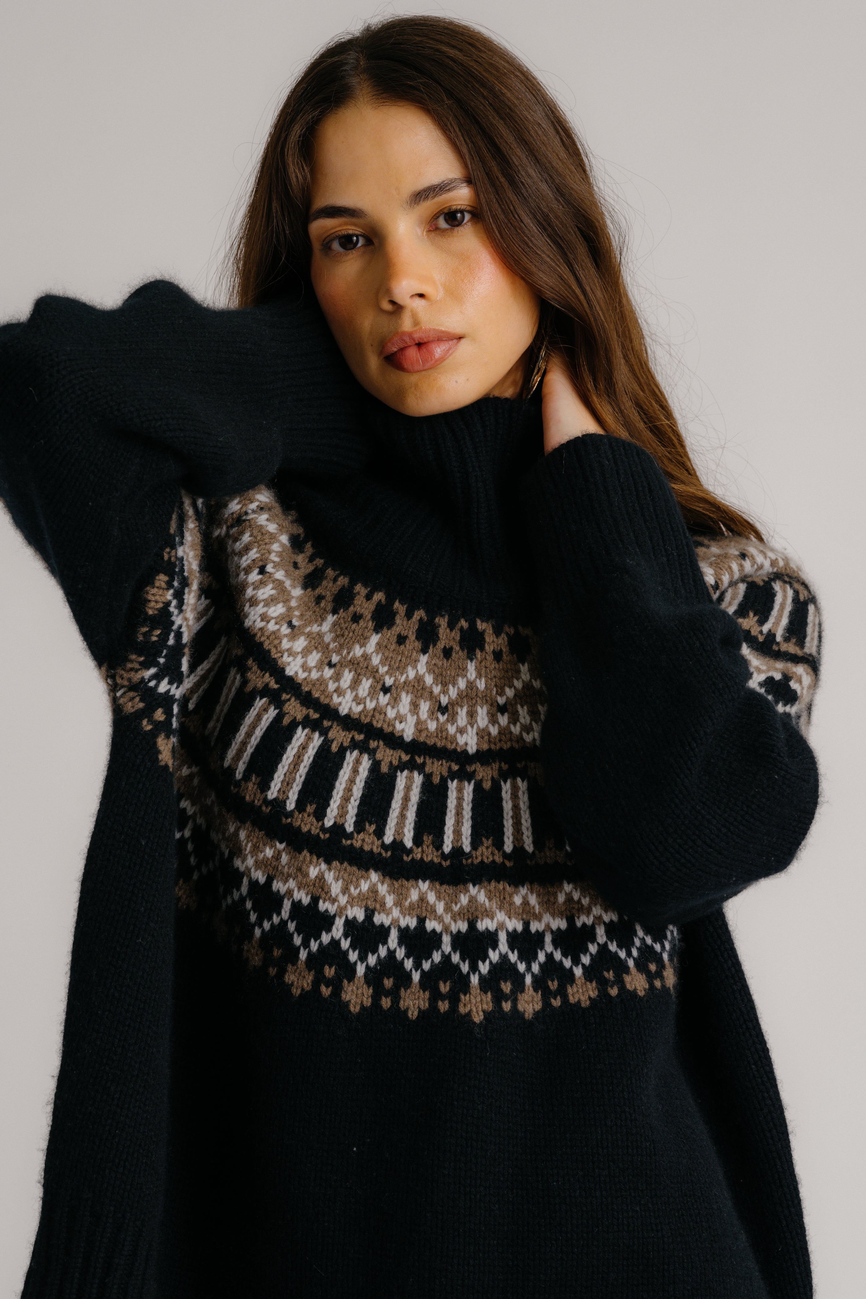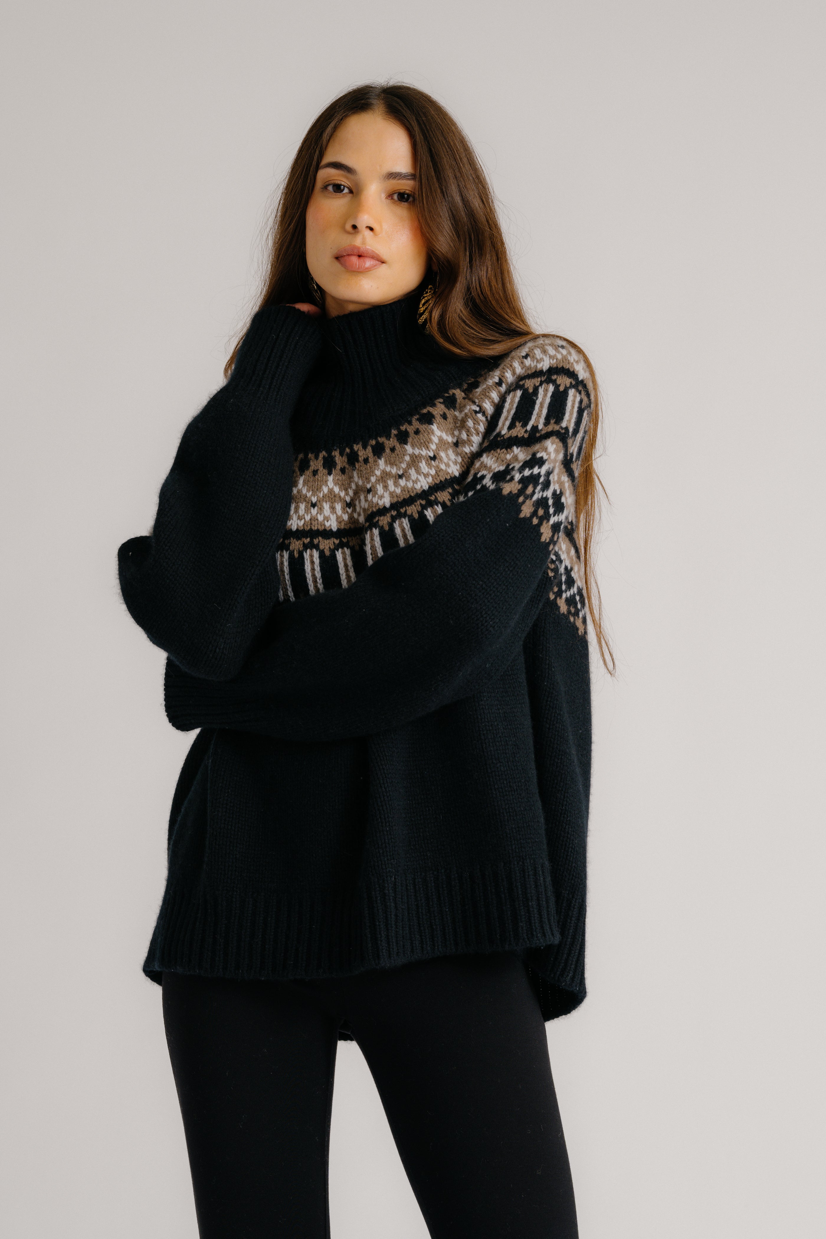 SCOTTIE SLOUCHY FAIR ISLE CASHMERE MOCK NECK | BLACK FAIR ISLE